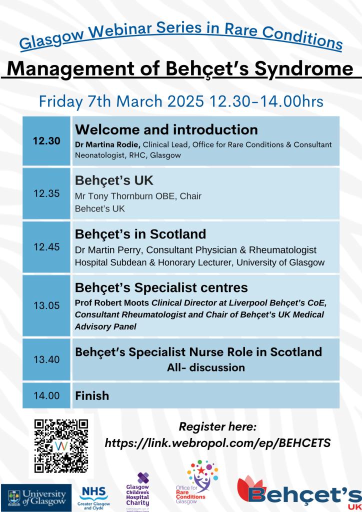 Office for Rare Conditions Glasgow Webinar Series Management of Behçet’s Syndrome Friday 7th March 2025 View recording below Management of Behçet’s Syndrome